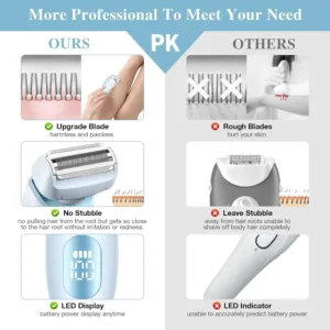 【Gentle & Painless Womens Electric Razors】Are you still enduring painful waxing or razor burn of regular razors? Throw away your rough razors and say goodye to shaving cut! Try our improved and specialized electric shaver for women, it gives you seamless shave to reveal smooth silky skin. The hypoallergenic blades makes it quite gentle shaving for dry or sensitive skin. Please keep the square razor head at 30°- 60° angle over your skin and shave against hair growth to get best shaving result.